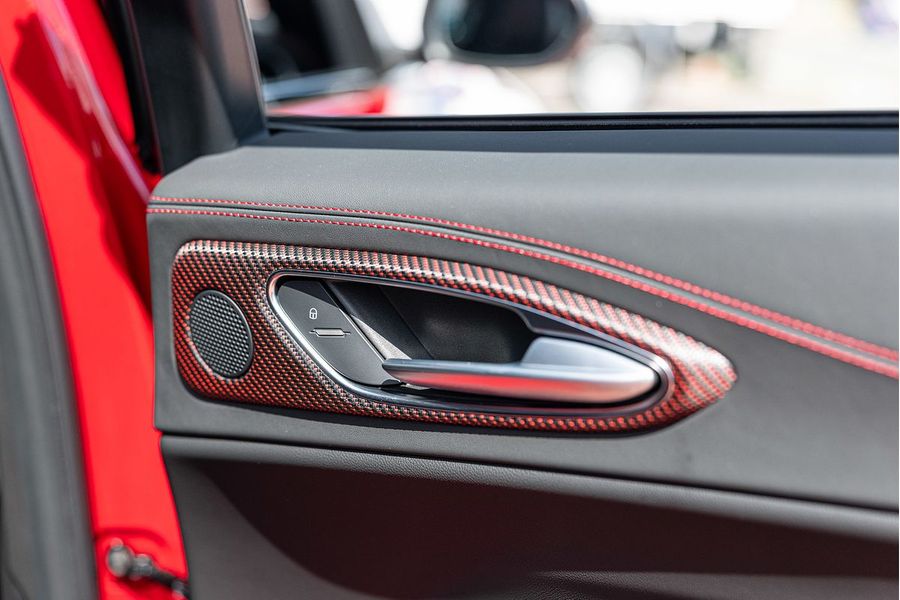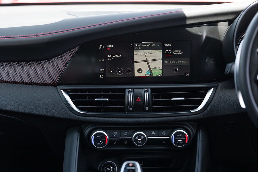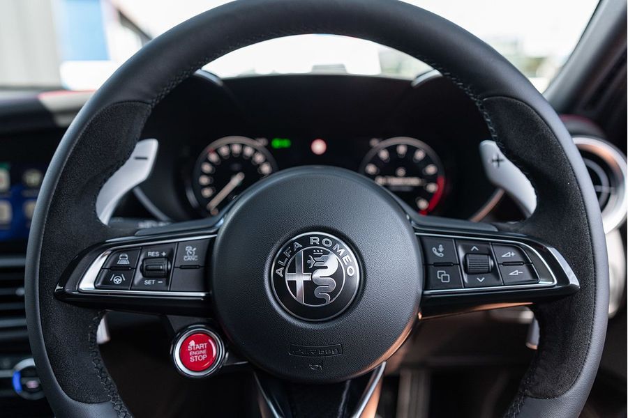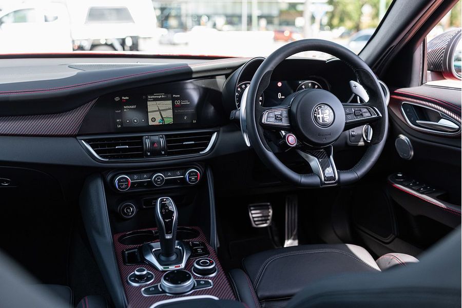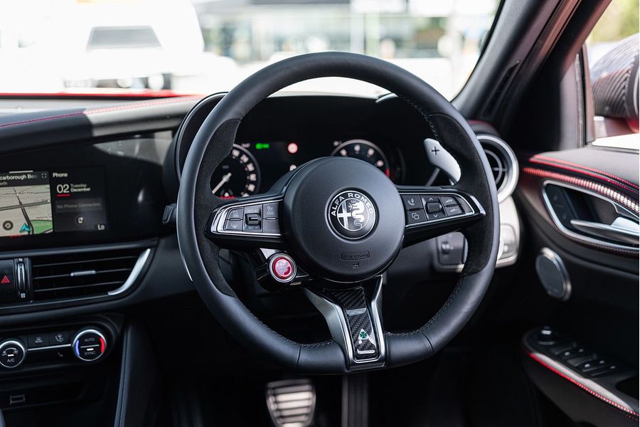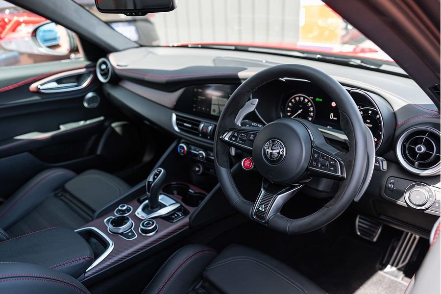 The driver of the All-New Alfa Romeo Giulia Quadrifoglio Super Sport is always at the centre, in a cockpit designed with the same approach as the exterior: minimalistic, with a use of sophisticated materials such as carbon fibre and leather. Powered by a 2.9L V6 BiTurbo, 375kW 600Nm 8-Speed ZF Automatic with Manual Shift Paddles. This Rear Wheel Drive Performance icon reaches 0-100 km/h in 3.9 Seconds onto a top speed of 307 km/h. Fuel Consumption is rated at a combined