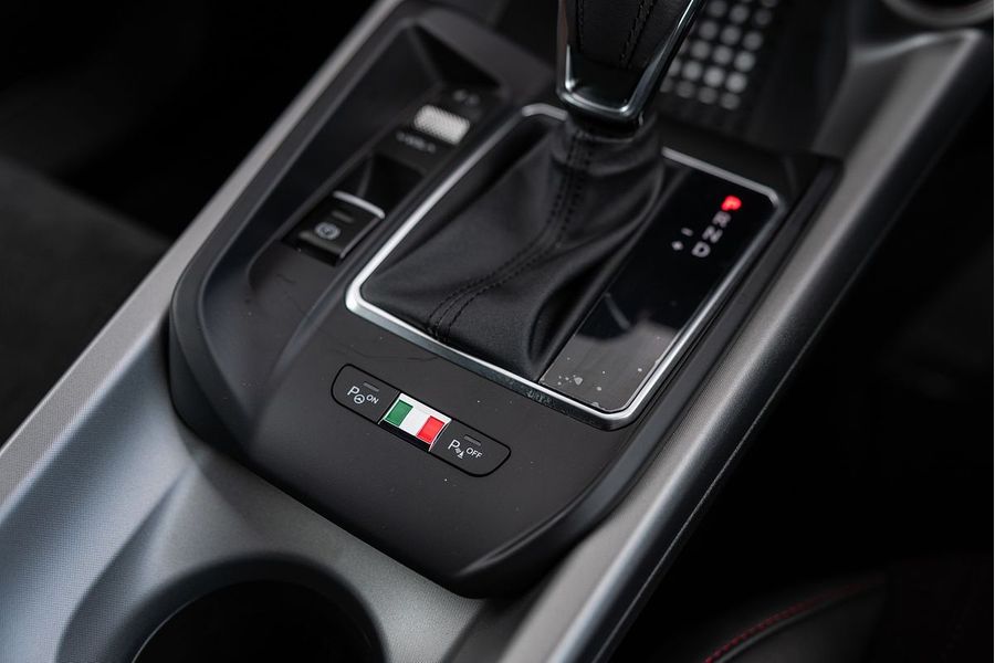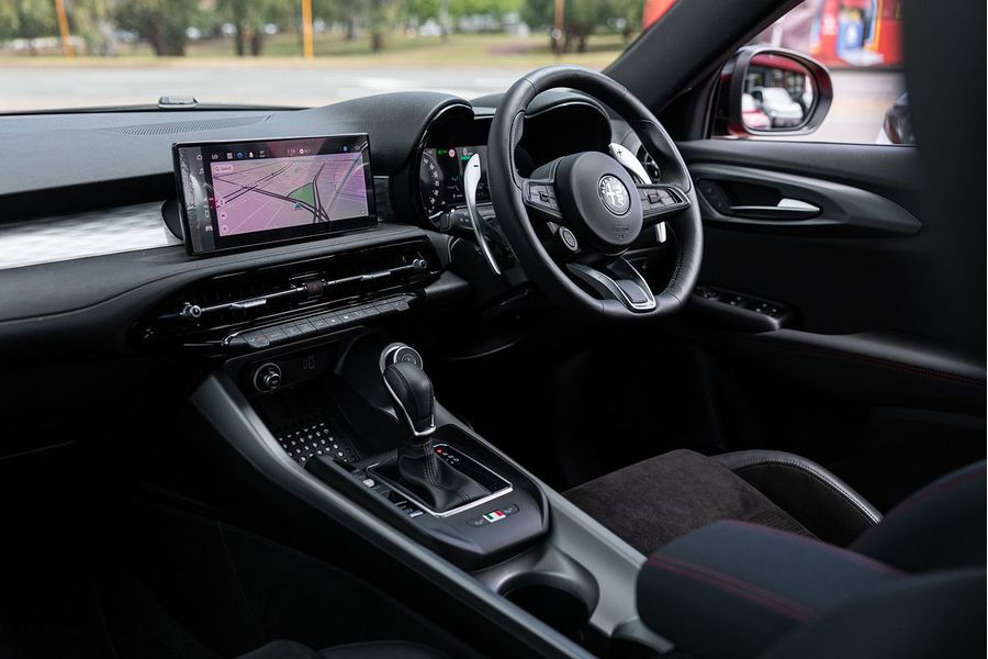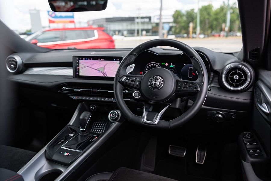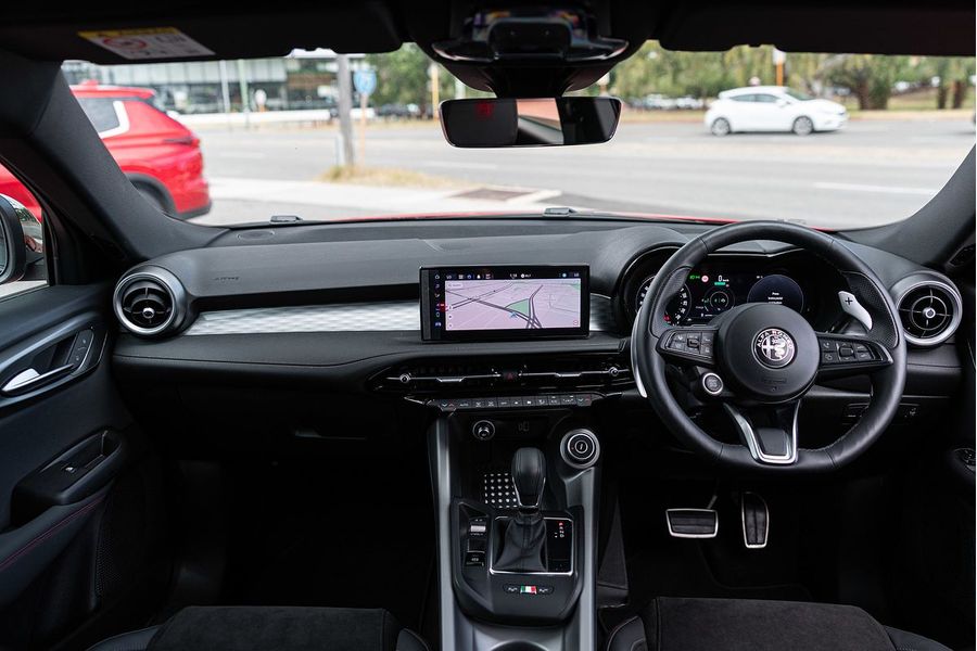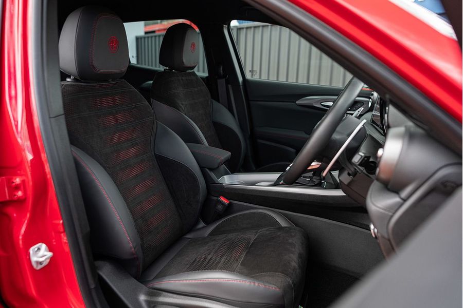 - Perforated Alcantara Seats with Embroided Alfa Romeo Logo and Red Stitching